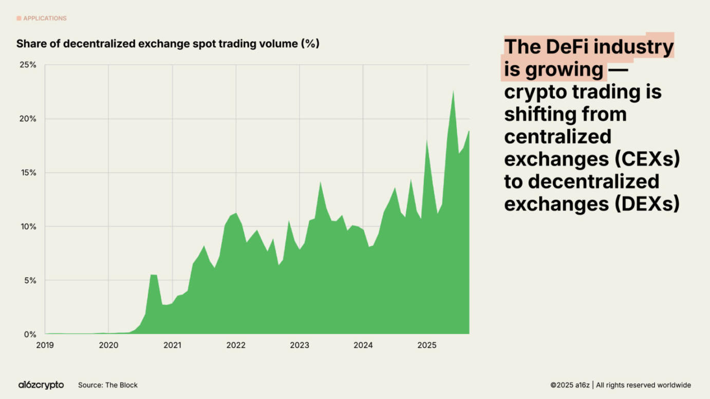 曾經,鏈上經濟只是早期採用者的小眾領域;如今,它已發展為覆蓋多個產業、每月活躍用戶數千萬的大型市場。目前,近五分之一的現貨交易量來自去中心化交易所(DEX)。
