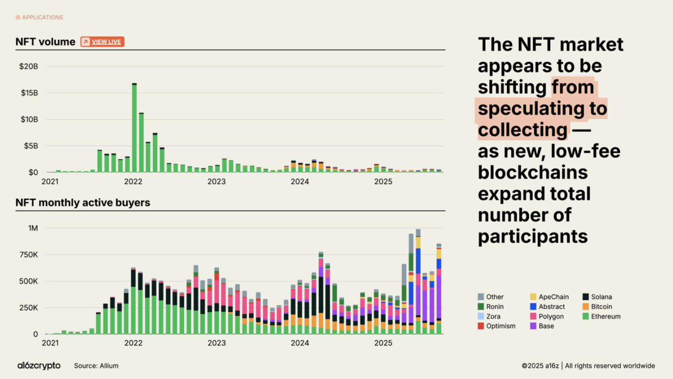 NFT(非同質化代幣)市場交易量雖遠未達到 2022 年的峰值,但每月活躍買家數量持續成長。這一趨勢表明,消費者行為正從投機轉向收藏。 這一轉變的背後,是 Solana、Base 等公鏈低成本區塊空間的普及。