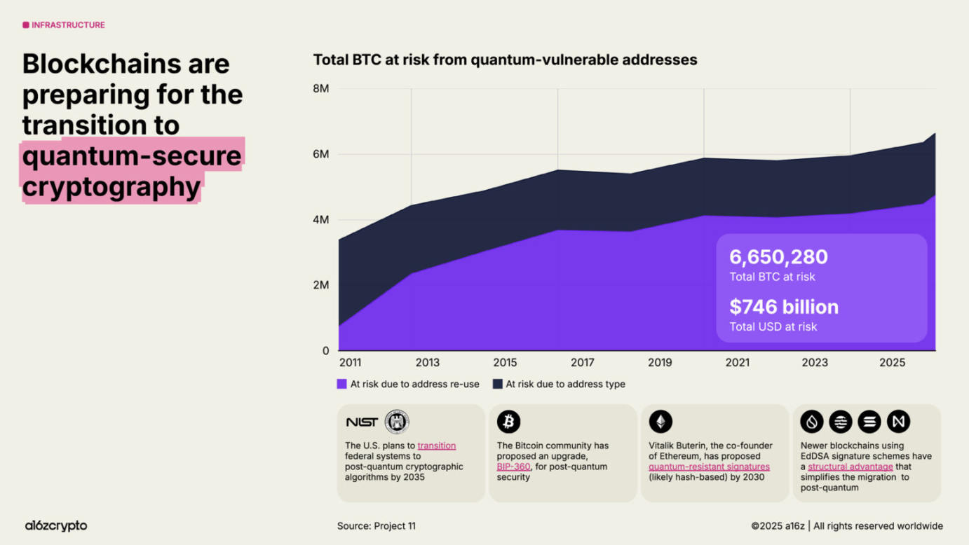 同時,區塊鏈正加速推進「後量子運算」 準備工作。目前,約 7,500 億美元的比特幣儲存在易受未來量子攻擊的地址中;美國政府計劃在 2035 年前,將聯邦系統遷移至後量子加密演算法。