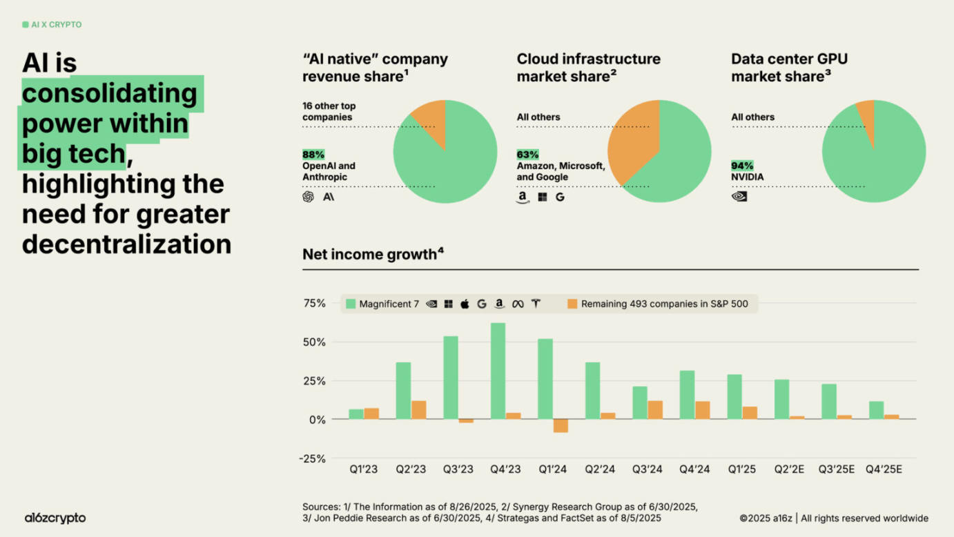目前,AI 的計算層正逐漸向少數科技巨頭集中,引發「中心化」 與「審查風險」 擔憂。 OpenAI 和 Anthropic 兩家公司控制著「人工智慧原生」公司 88% 的收入。亞馬遜、微軟和谷歌控制著 63% 的雲端基礎設施市場,而英偉達則佔據了 94% 的資料中心 GPU 市場。這些失衡推動了「七巨頭」在過去幾年中實現了兩位數的季度淨收入成長,而標普其餘 493 家公司的整體獲利成長卻未能跑贏通膨。