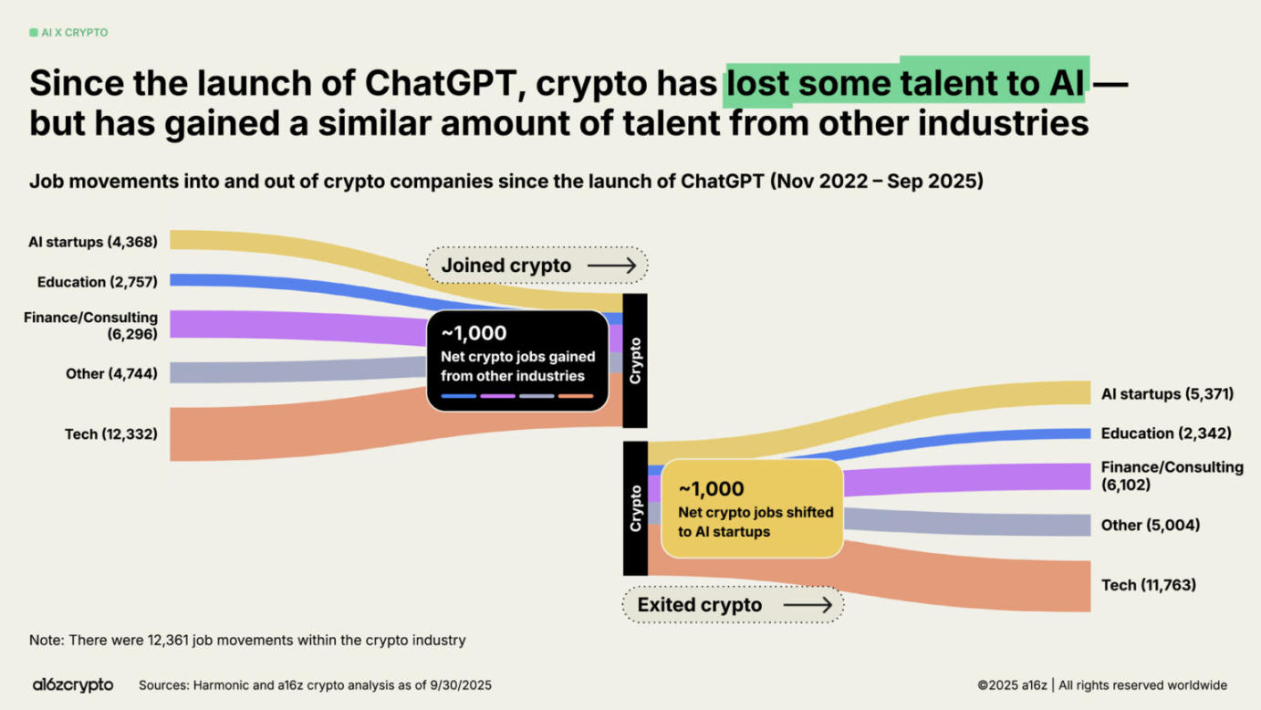 在人工智慧熱潮的帶動下,一些開發者放棄了加密貨幣領域。我們的分析表明,自 ChatGPT 推出以來,約有 1,000 個工作從加密貨幣領域轉向了人工智慧。但這一數字被同樣數量的開發者從其他領域(例如傳統金融和科技)加入加密貨幣領域所抵消。