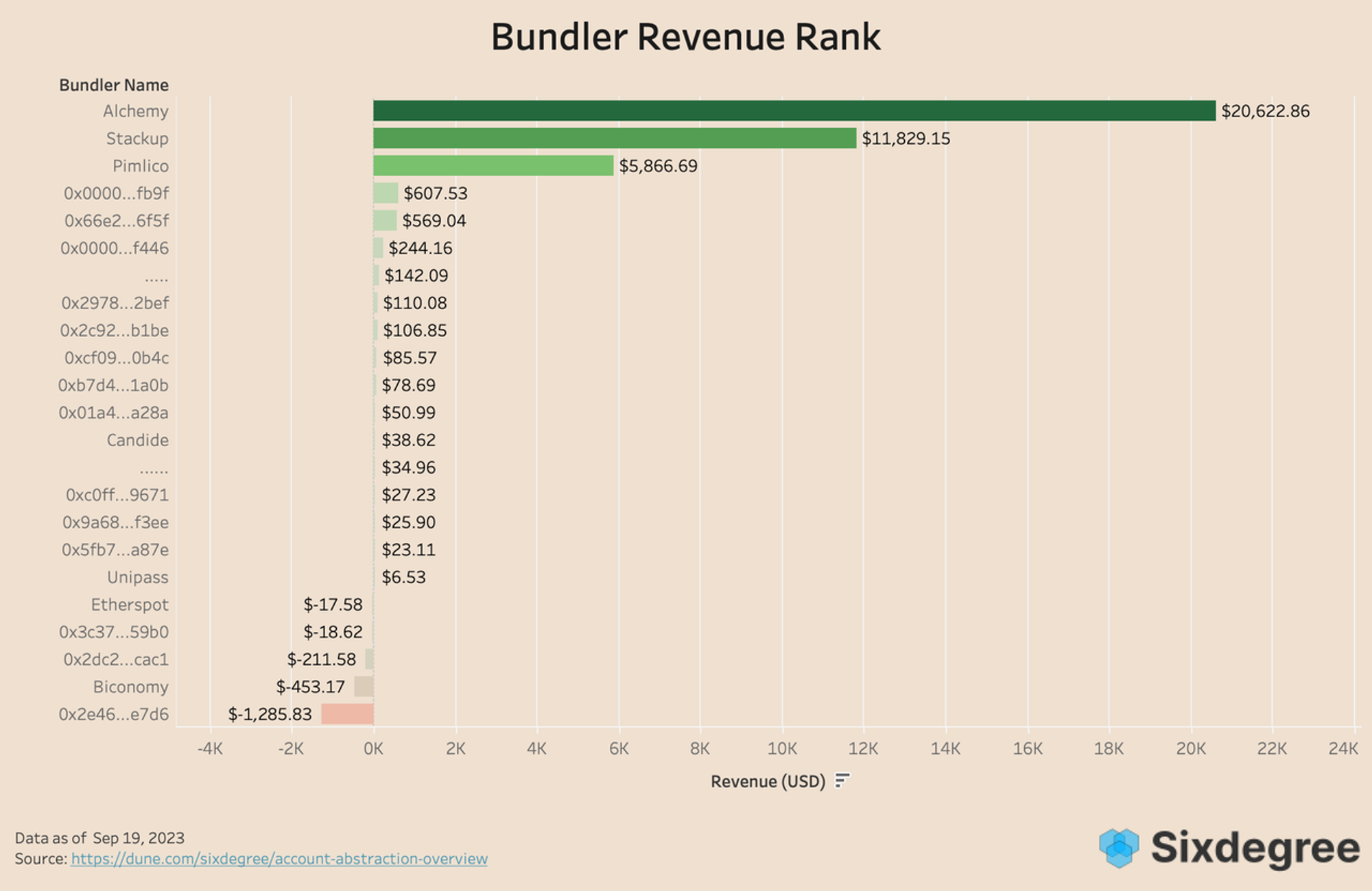 目前所有bundler 共產生約$38k 的利潤,88.38% 都處於不賺不賠的狀態,其中Alchemy 以$20k 的利潤位居榜首,Stackup 和Pimlico 以$11k 和$5.8k 位居二三。