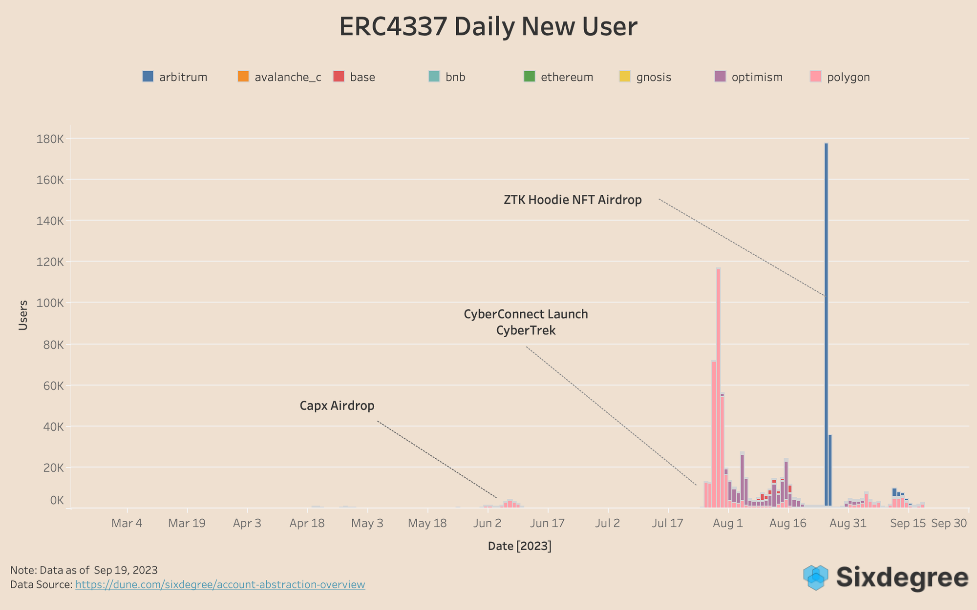 UserOp 的成長基本上遵循著用戶成長的曲線,唯一不同的是UserOp 的成長有四次,因為CyberConnect 的空投在Optimism 主網上發放,需要用戶用AA 錢包領取。