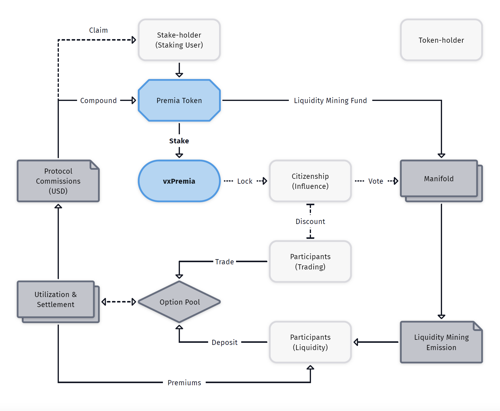 PREMIA 是 Premia 的原生 Token,與 CRV 類似,用戶通過鎖倉 PREMIA 以獲得 vxPREMIA,並通過持有量和鎖倉時長增強自己的「影響力」。影響力的應用場景包括:增強流動性挖掘收益、疊加協議費用分配以及提升治理投票權重等。