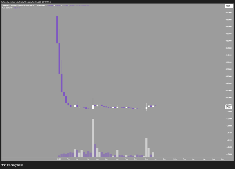 以這張圖表為例,它展示的是 Zerebro,從2,000 萬美元市值一路飆升至7 億美元峰值,帶來 30 倍回報;但它也從高點下跌了 99%,幾乎回到了最初的起點。