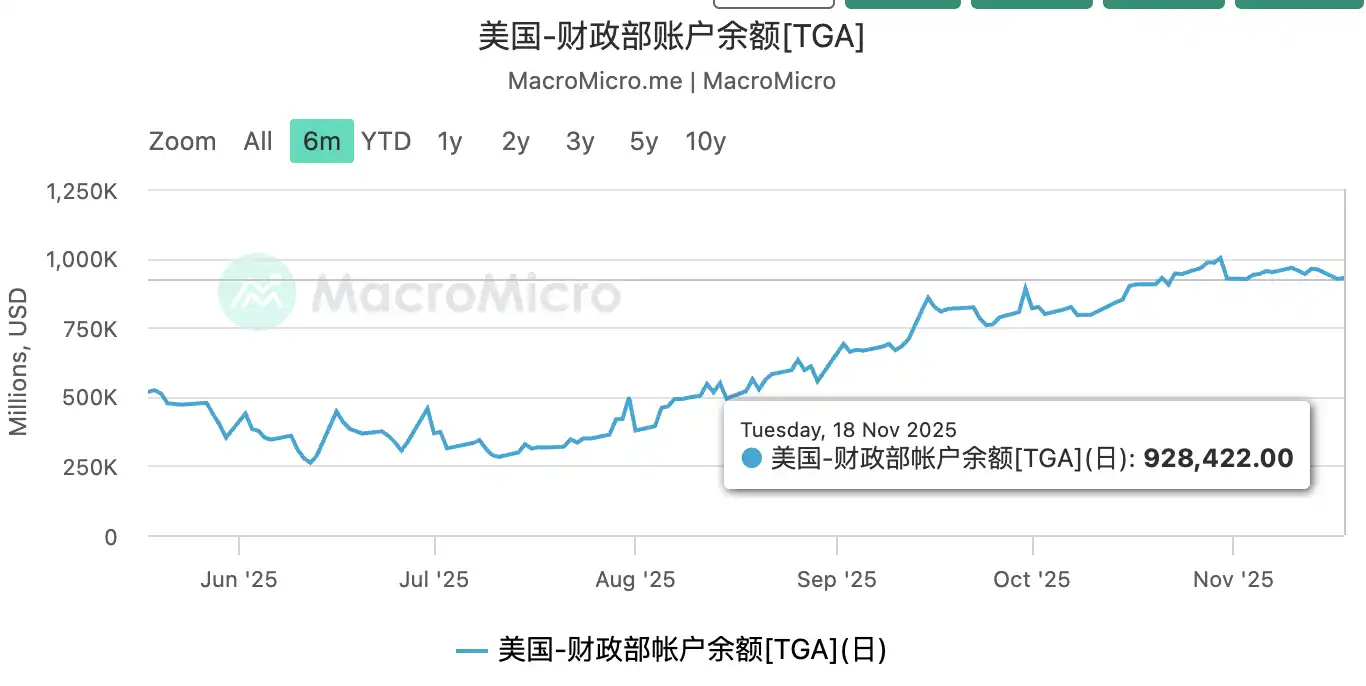 數據顯示,從 2025 年 10 月 1 日至 11 月 12 日這 43 天期間,TGA 餘額持續累積,到 11 月 14 日達到 9,590 億美元的高點。這個水準遠高於財政部通常維持的現金部位,主要是因為政府停擺期間支出受限,加上持續發債籌資,導致現金大量累積在國庫帳戶中。