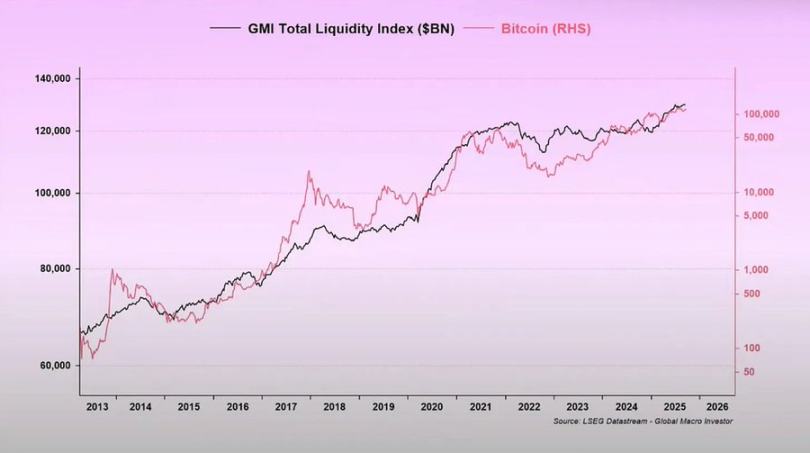 - 流動性管道:全球總流動性即中央銀行和銀行系統儲備的總和自2009 年以來追蹤了90% 的風險資產表現。