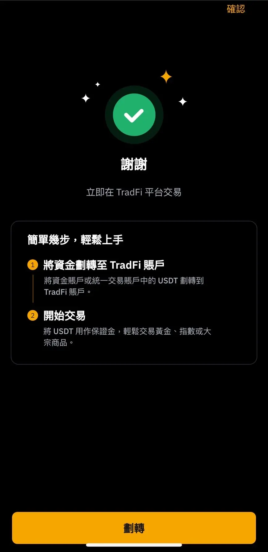 - 內部劃轉:將 USDT 從主帳戶劃轉至 TradFi 帳戶