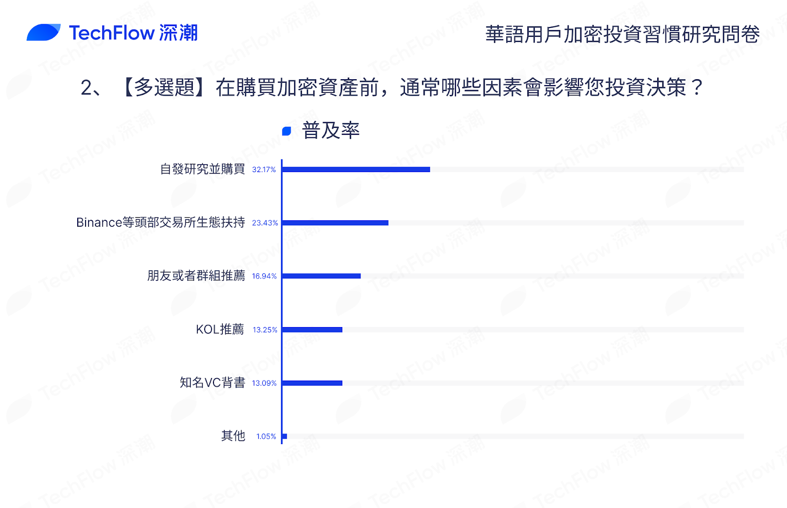 總的來說,自發性研究併購買是影響受訪者投資決策的最主要因素,有77.71% 的受訪者選擇了該選項,在資訊管道不斷多元化的背景下,投資者更能深入研究項目的基本面和技術細節,從而做出更理性的投資選擇。
