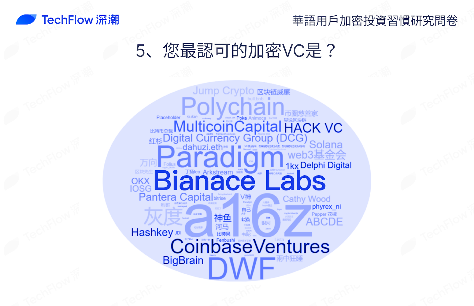 根據詞雲展示,我們可以觀察到a16z、Paradigm、Binance Labs、Coinbase Ventures等老牌加密VC提及頻率較高。