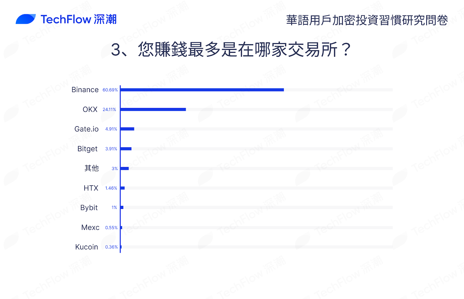 具体而言,Binance 是受访者赚钱最多的交易所,60.69% 的受访者在此获得最高收益,这表明 Binance 不仅在市场份额上占据主导地位,还为用户提供了显著的盈利机会。