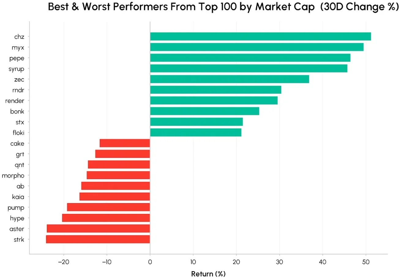 過去一個月,表現亮眼的幣種包括 PEPE、BONK 等 Memecoin,主打隱私保護的 Zcash(ZEC),以及機構信貸平台 Maple Finance(SYRUP)。這一現象表明,市場對於 Memecoin、隱私類幣種,以及具備明確收益分成機制和可見現金流增長的 DeFi 代幣的興趣正在回升。