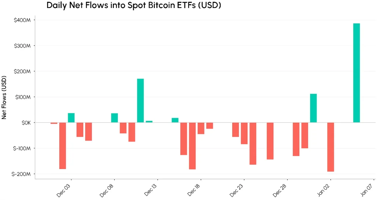 - 現貨比特幣 ETF 在 1 月 5 日扭轉了年底的資金外流趨勢,淨流入約 4 億美元;巨鯨出貨行為有所收斂,散戶則在積極增持籌碼。