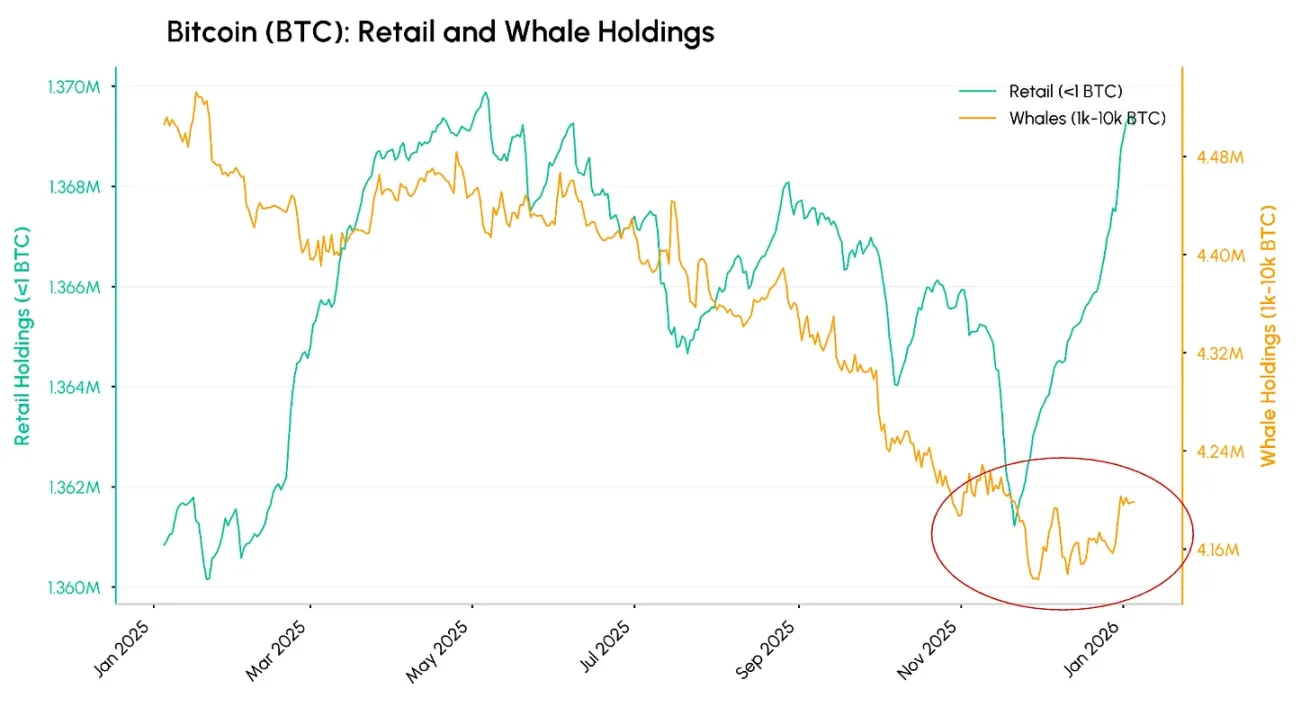 鏈上數據顯示,進入 1 月以來,持有 1,000-10,000 枚比特幣的巨鯨錢包的代幣拋售行為明顯收斂,這意味著來自這一群體的拋壓正在減弱。同時,持倉量不足 1 枚比特幣的散戶投資者,自去年 11 月中旬以來一直在加速增持。隨著加密貨幣價格從高點回落並盤整,散戶正逢低佈局。巨鯨拋售減少疊加散戶持續買入,共同建構了市場的有利格局。