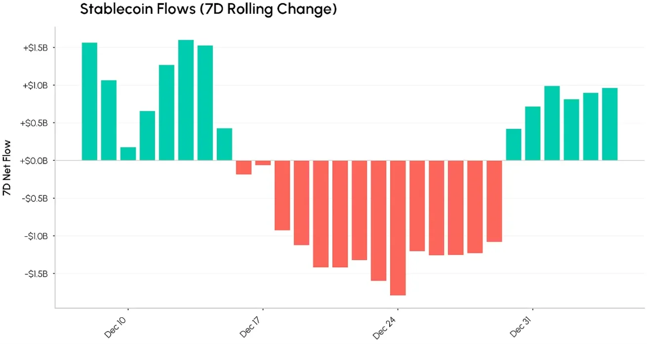穩定幣的資金流向,是觀測加密市場資金進出的重要指標。去年 12 月初,穩定幣市場曾持續錄得資金淨流入,不過臨近年末,資金流向由正轉負,單週淨流出規模超 10 億美元。進入 2026 年 1 月後,穩定幣資金流動趨於平穩,並重新轉為淨流入。如果這一趨勢能夠延續,將為加密市場的持續上漲提供強大支撐。