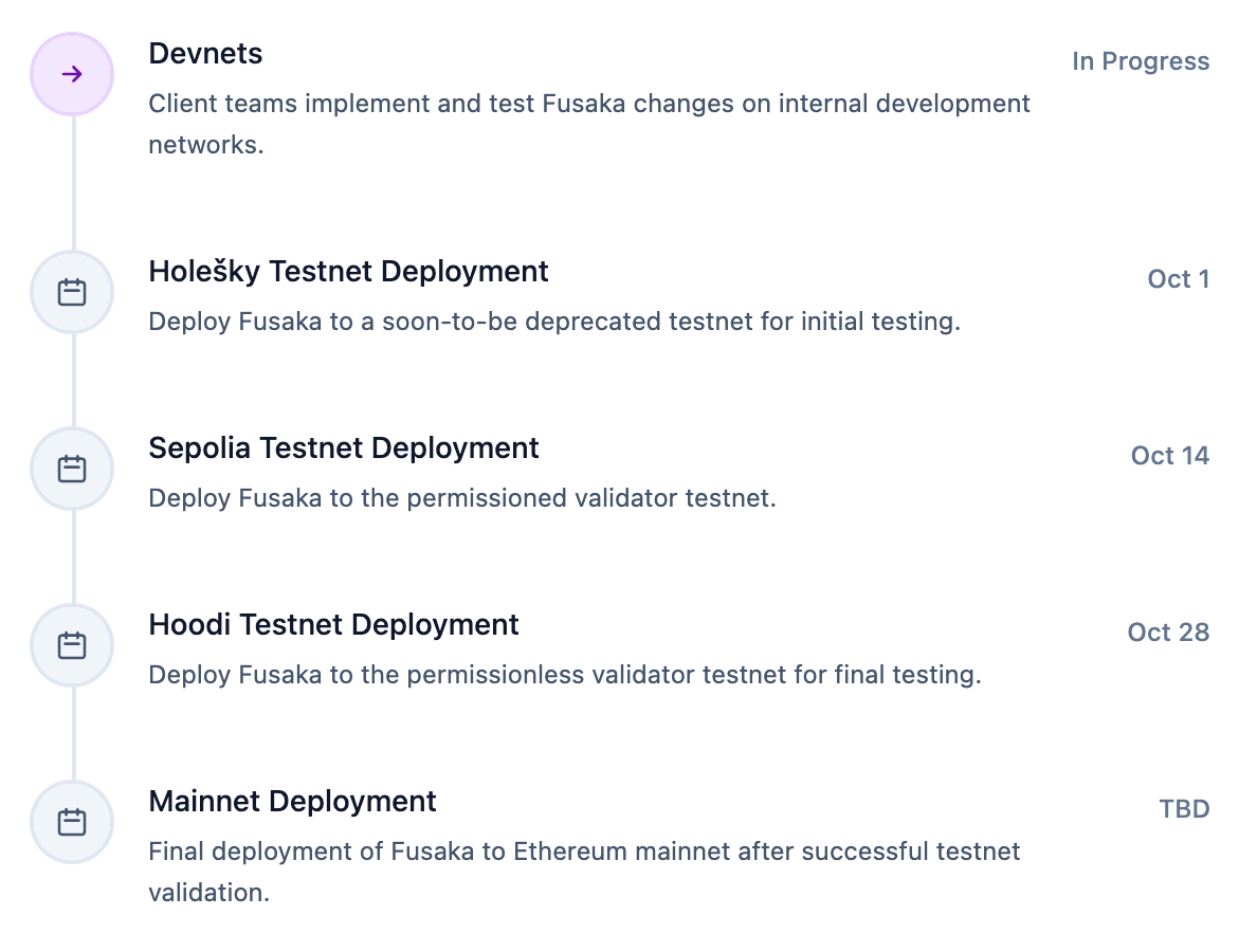 以太坊升級總是先通過測試網,然後才到達主網。 Fusaka 的rollout 是分階段的: