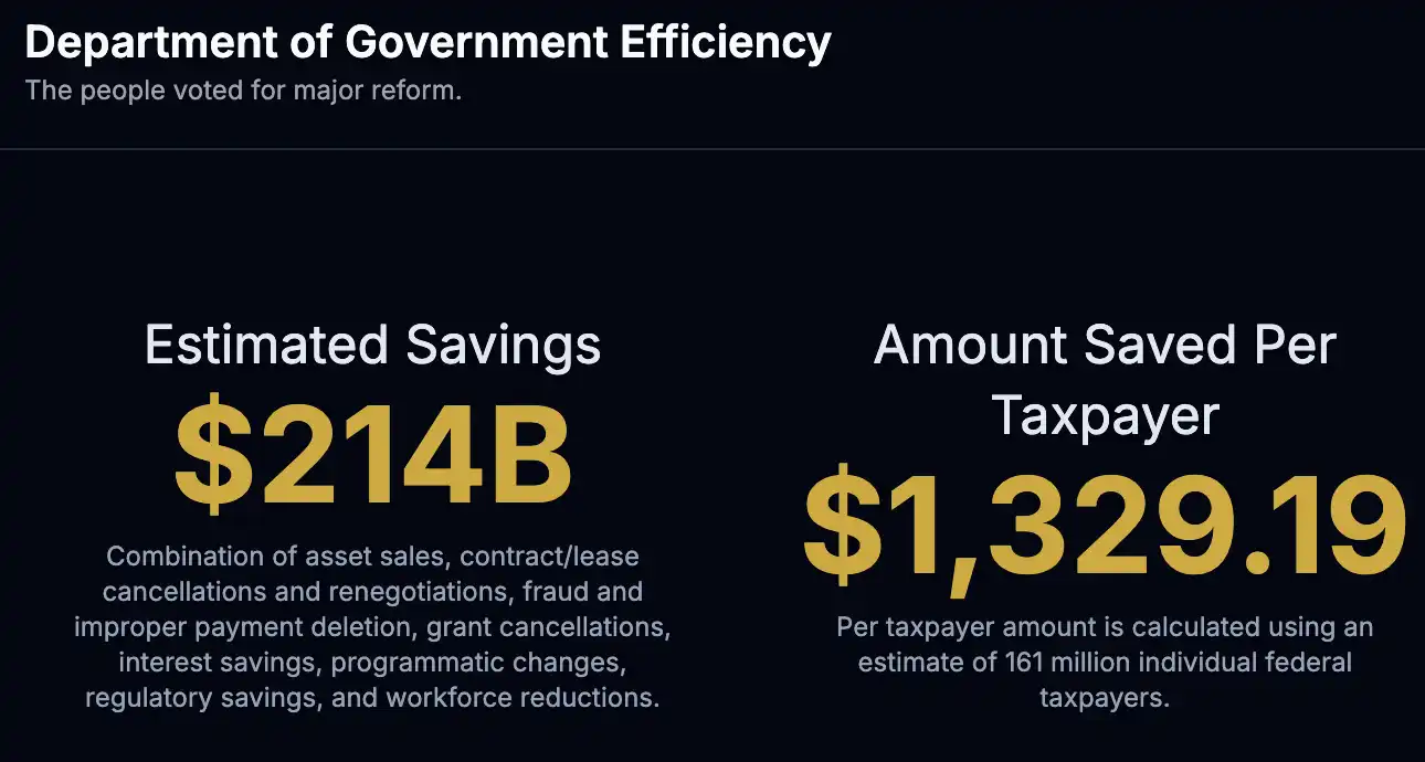 截至撰稿時間,DOGE 網站聲稱該部門透過「資產出售、合約/租賃取消與重新談判、詐欺和不當付款刪除、撥款取消、利息節省、專案變更、監管節省和裁員」共同獲得了2140 億美元的節省,相當於每位納稅人1329.19 美元。