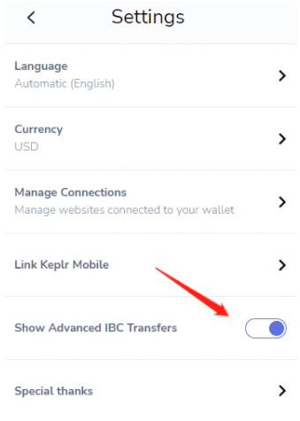 沒有這個按鈕的話,可以在 Keplr 的錢包裡,找到 Setting,開啟 IBC 功能。(錢包中使用 IBC 較為複雜,開發者為了避免大家誤用,默認關閉了這個功能,需要手動開啟。正常的 IBC 交易都是網頁 UI 中操作,極絲滑。)