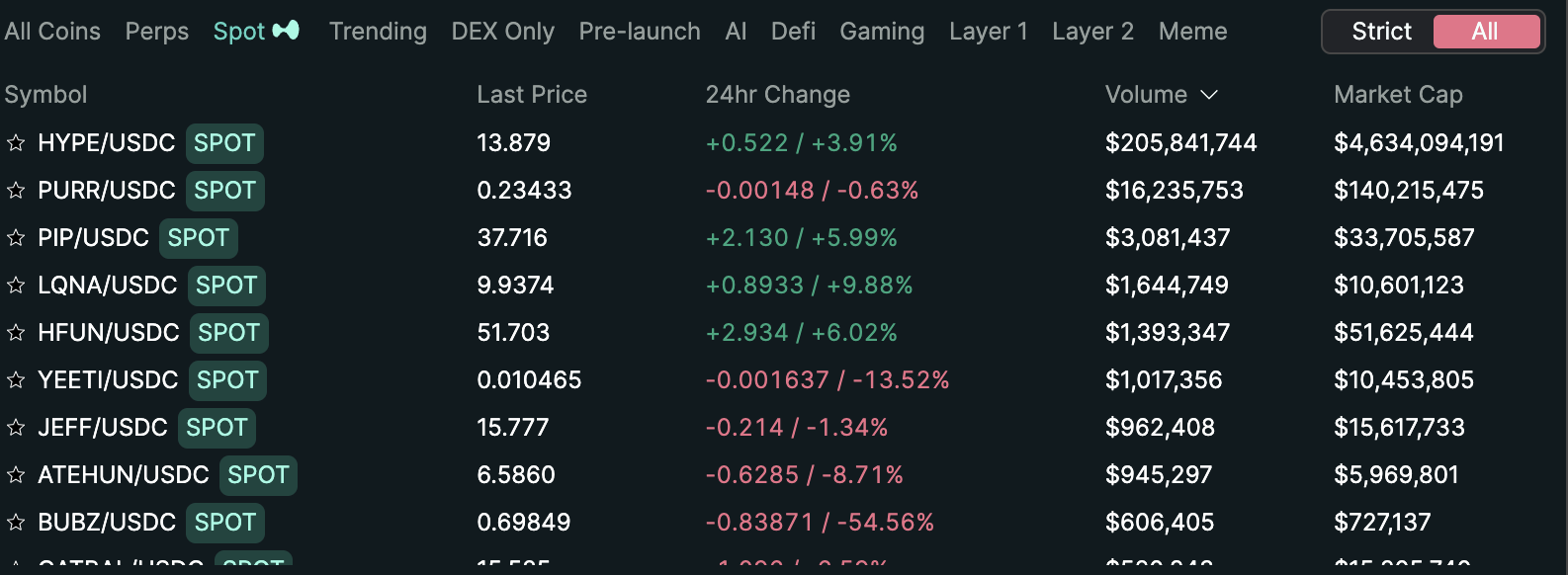 但從上線的上百個HIP-1代幣的流動性來看,主要集中在少數項目。 Hyperliquid交易數據顯示,截至12月10日,該平台上線的HIP-1代幣達上百個,過去24小時累計交易量約為2.4億美元,其中Hyperliquid代幣HYPE就佔據總交易額的85.9% ,其生態頭MEME專案PURR佔比超6.7%,剩餘項目合計流動性佔比僅7.4%。這與Hyperliquid主要發力於衍生性商品交易有關,現貨市場在MEME興起後才逐漸成型。