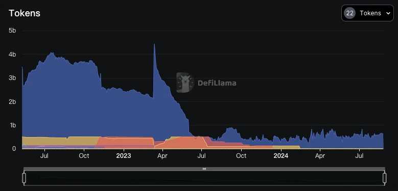 Ethena Labs 推出的 USDe 是今年熱度較高的穩定幣,目前已成為市值第五大的穩定幣。 USDe 雖然透過創新性的收益策略實現了 100% 的資本效率和較好的去中心化,但對於上行市場的過度依賴使其價格穩定性堪憂。 USDe 今年已經經歷過幾次壓力測試,USDe 的供應量自 7 月以來持續減少,目前已經跌破 25 億。