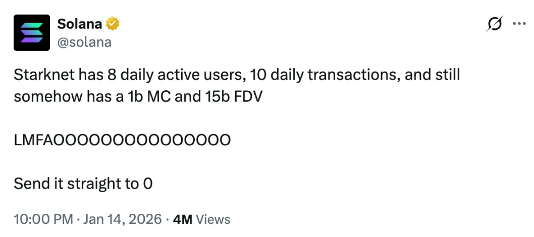 近日,Solana 開了個 Starknet 的玩笑,吐槽一個只有 8 個日活用戶,每天 10 筆交易的 L2 居然還有 150 億美元的 FDV。