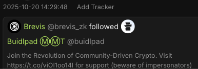 2、Brevis 官方帳號在 10 月 20 日追蹤了 Buidlpad 官方帳號。
