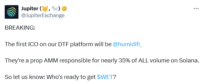 10 月 30 日,Jupiter 在 X 平台發文表示,其 DTF 平台上的首個 ICO 專案將是 HumidiFi。