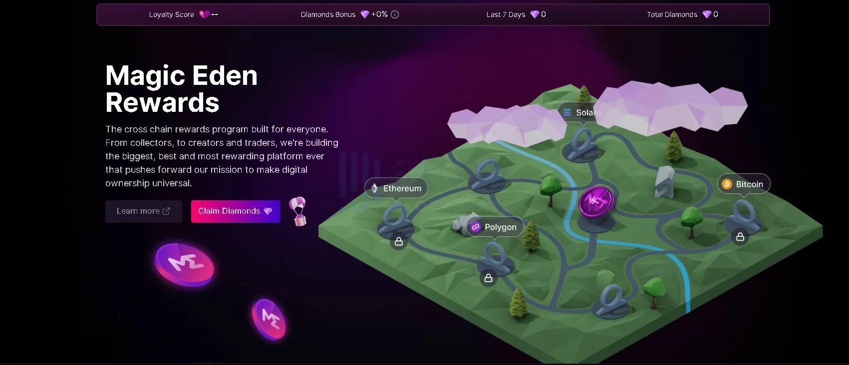而此前,Magic Eden 的官方文檔已確認將有$NFT 代幣,可以猜測,用戶獲取的鑽石或許可以稍後將其轉換為 NFT 代幣。對於 NFT 代幣的空投標準,可能涉及 3 個方面,包括 NFT 總交易量、忠誠度得分以及收集的鑽石數量,而後者可能是主要標準。