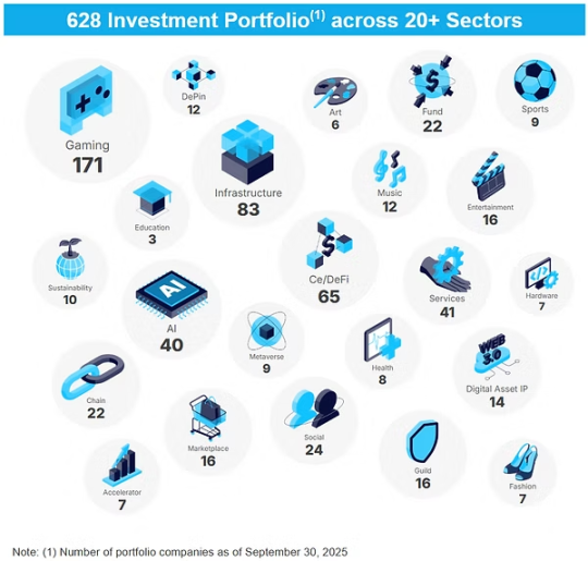 最上層仍是大家熟悉的內容與流量:鏈遊、NFT、IP 合作等,構成面向使用者的前台。 The Sandbox 依然是像徵性入口。中層是投資與資產網絡。 Animoca Brands 多年來累積的股權和代幣部位,已涵蓋交易所、基礎設施、公鏈、DeFi 協議、內容平台等多個賽道的 600 餘項目。它的資產負債表就像是 Web3 的產業地圖。