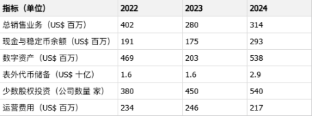 根據 Animoca Brands 披露的近三年主要數據(如下表),2022–2024 期間總體收入略有回落,但數位資產與股權投資規模持續增長,運營支出保持穩定,顯示出業務從投機週期向穩態資產配置過渡的跡象。