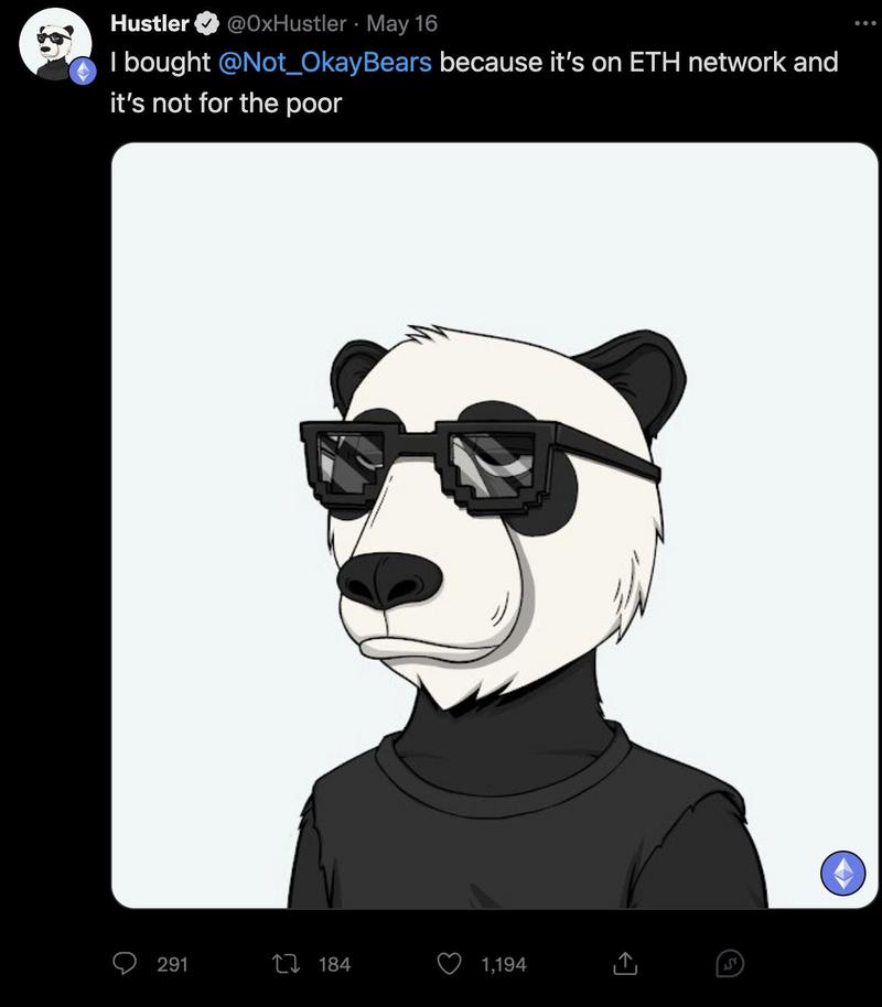這一增長主要源於一些NFT KOL的大批掃貨和喊單。其中,Hustler在5月16日的一條喊單推特充分製造了爭議點,並為Not Okay Bears吸引了不少流量,他指出Not Okay Bears是以太坊鏈上的NFT,“而不是給那些窮人的”,直指Solana是“窮人鏈”。並且在每一條表示自己購買了Not Okay Bears NFT的推特下評論:“Cheers to not being poor”(為不做窮人鼓掌)。
