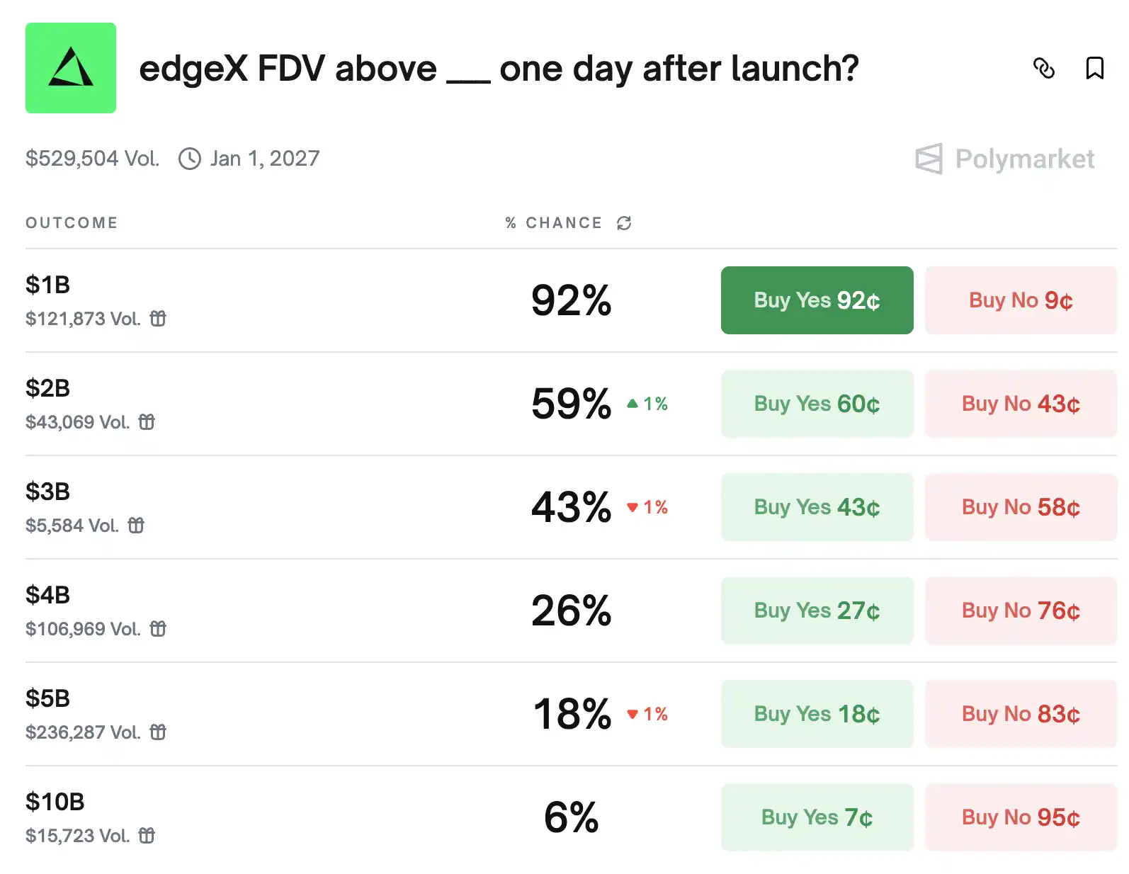 根據社區大 V 的測算,依照 edgeX 營收約為 Hyperliquid 的 16% 來估算,如果 TGE 時 FDV 達到 20-70 億美元左右,單積分價值可能在 30-300 美元區間。當然這只是預估,實際上還要看市場狀況。目前 Polymarket 上的 edgeX 在 launch 第一天的 FDV 可能性機率如下: