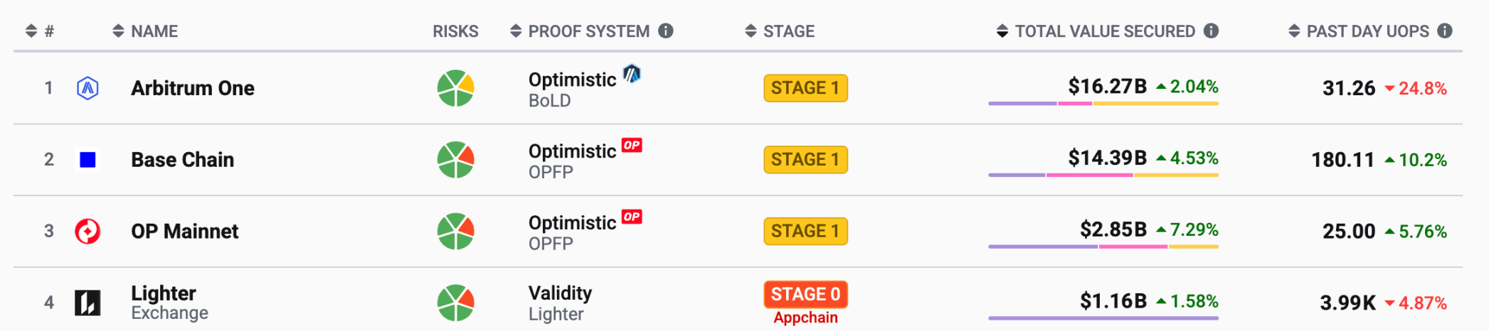 事實上,Lighter 並非一開始就瞄準了 perp DEX 的方向。 2022 年底上線的 Lighter 是 Arbitrum 上的現貨 DEX,在 2023 年才開始轉型 perp DEX,並著手開發自己的 ZK Rollup,主網更是今年 10 月才正式上線。不過上線只有一個多月的 Lighter 已經成為了 TVL 僅次於 Arbitrum One、Base 和 OP Mainnet 的第四大 L2。連 OG 藍狐都感嘆沒想到客製化 L2 會比通用型 L2 先跑出來。