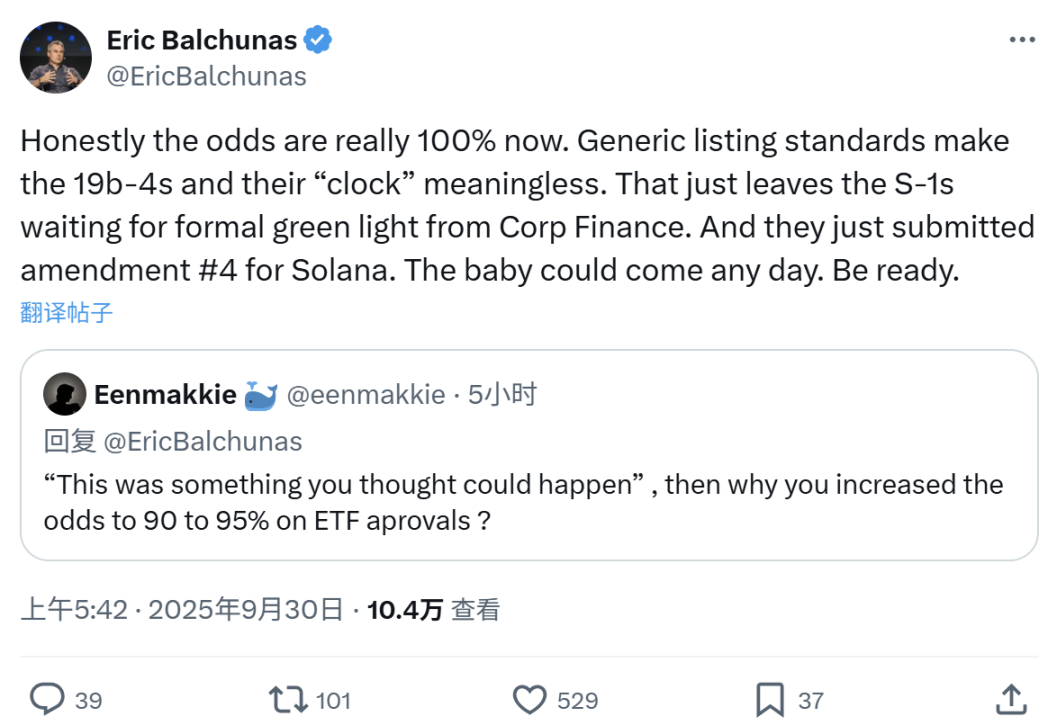 針對SOL 的現貨ETF 情況,彭博ETF 分析師Eric Balchunas 表示,「說實話,SOL 現貨ETF 獲批的成功率現在接近100%。通用的上市標準讓19b-4 文件及其時間節點變得毫無意義,現在就只剩下S-1 表格相關事宜了。孩子隨時都可能出生,孩子隨時準備吧。