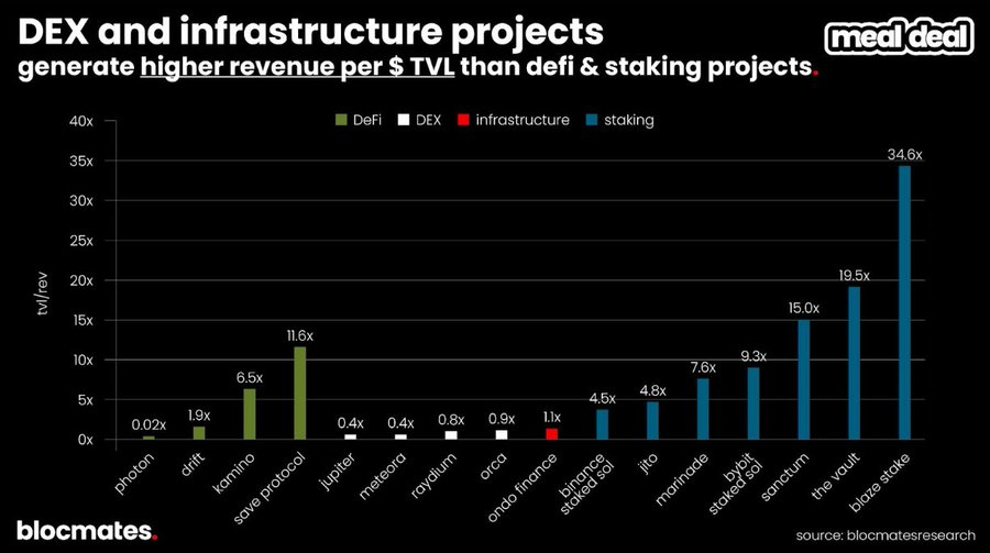 質押產品的短板在於獲利能力較弱:平均而言,一個質押協議需要 21.7 倍的 TVL 才能達到本次樣本中 DEX 的平均收入水準。這再次說明了一個事實──在加密世界裡,投機者貢獻的利潤遠高於儲蓄者。