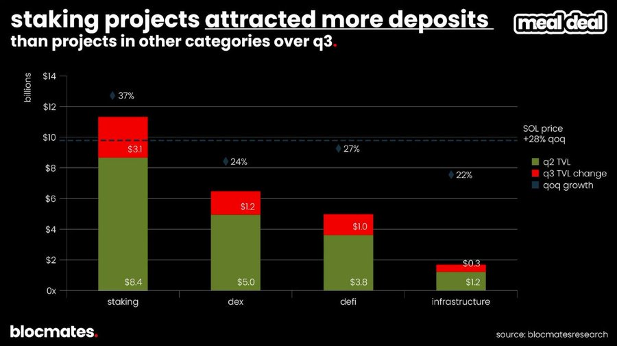 從 TVL 成長速度來看,質押類產品 是三季 Solana 應用中的絕對亮點,幣安和 Bybit 提供的質押 SOL 以及 @Sanctumso 的產品在三季均錄得超過 50% 的成長。