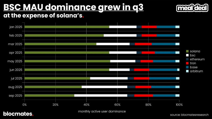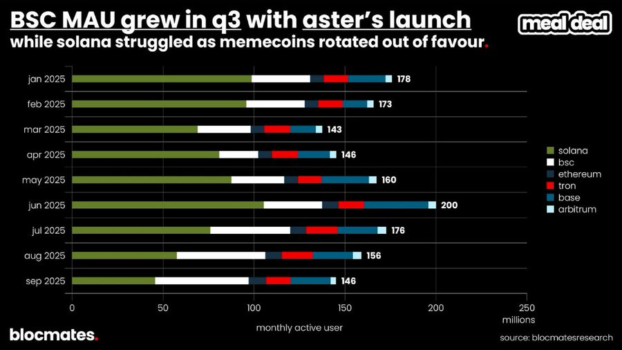 就用戶規模而言,Binance Smart Chain 在三季憑藉與 CZ 關聯的永續 DEX——Aster—— 奪走了最多的注意力。大量使用者要麼在初夏選擇離場,要麼從 Base 與 Solana 遷移至 BSC。