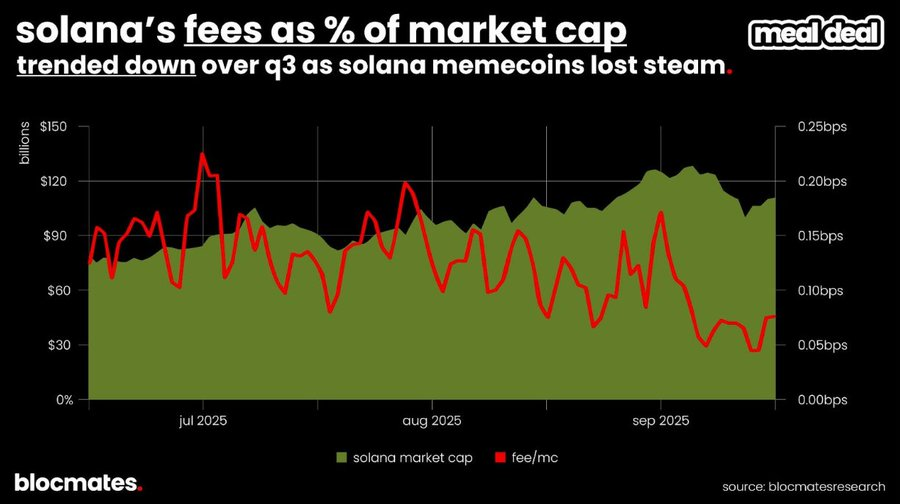 從數據來看,隨著交易者從 Meme 投機轉向永續合約,Solana 的鏈上收益指標出現明顯影響:鏈上費用佔 SOL 市值的比例自 7 月高點以來已下滑超過 60%。