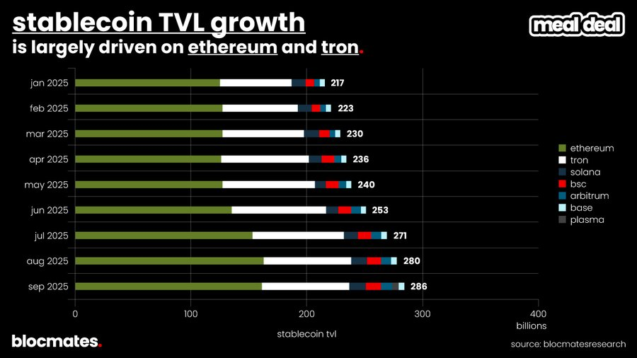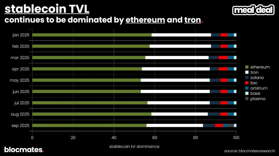 進一步拆解穩定幣 TVL 佔比就會發現,以太坊與 Tron 在過去幾季幾乎穩居主導,而一些新出現的應用鏈 —— 例如 @Plasma —— 開始逐漸擠入這個格局。