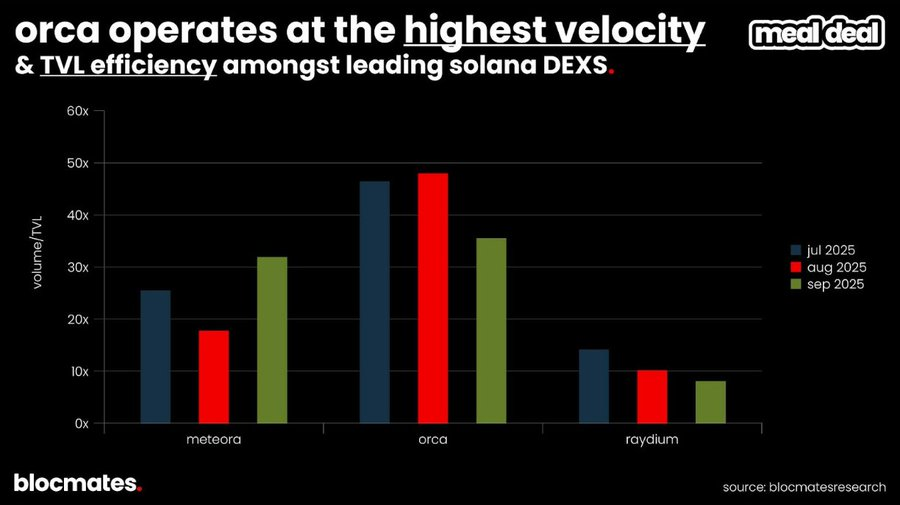 在 DEX 賽道中,@Orca_so 一直保持著 TVL 效率(即「交易速度」)的領先地位。在給定的流動性規模下,Orca 上每一美元的交易頻率最高。