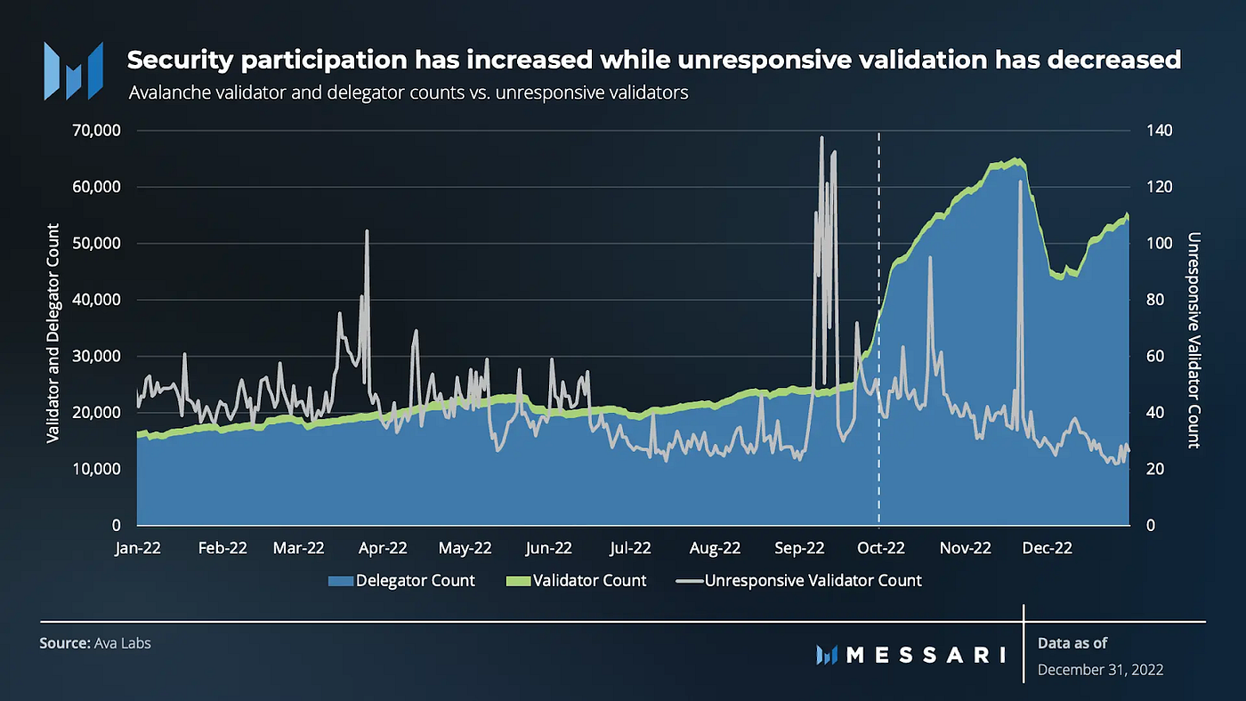 雪崩關鍵指標之一是網路的執行狀況。儘管 2022 年市場不好,但網路的質押仍然很強勁。平均參與的股份保持穩定在約 62%,並略有增長(約 2%)和同比。