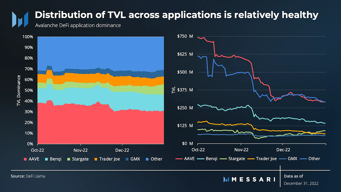 雪崩上的 DeFi 應用程式受到了 2022 年的宏觀經濟或 FTX 倒閉的影響。然而,前五名 DeFi 協議和較小協議之間的質押保持相對穩定。所有 “其他” 較小的協議約佔雪崩上所有 TVL 的 32%。TVL 在應用程式之間相對健康的分散帶來了更大程度的多樣化 TVL,從而降低了整體生態系統風險。