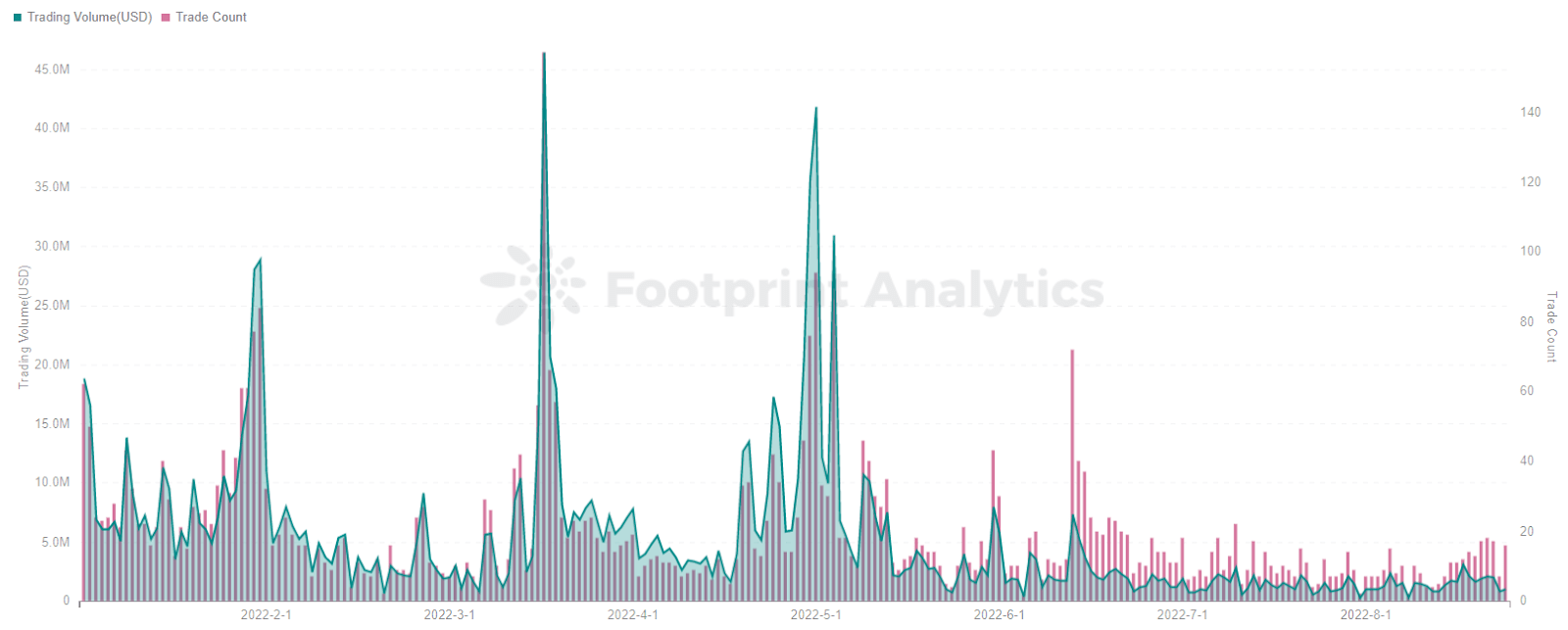 數據顯示,儘管 2022 年是加密貨幣的寒冬,但 BAYC 的交易並沒有停滯不前。從 2022 年 1 月到 5 月,交易量和交易次數出現了三次高峰。在每次高峰中,至少有 84 筆交易,總交易金額至少為 2,900 萬美元。
