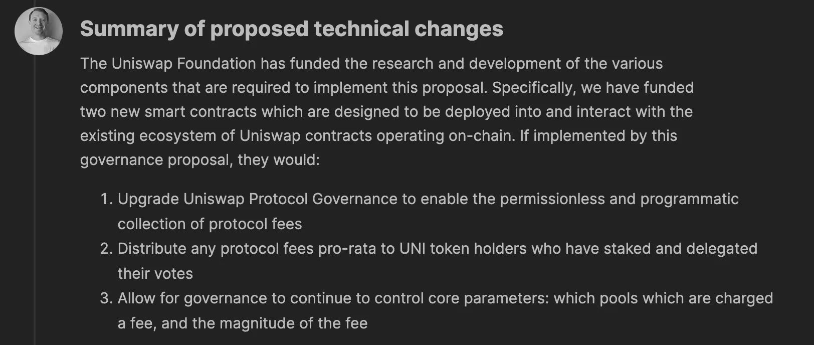本次提案涉及的兩個新智能合約為 V3FactoryOwner.sol21 和 UniStaker.sol22。提案全文可參考《[RFC] – Activate Uniswap Protocol Governance》。