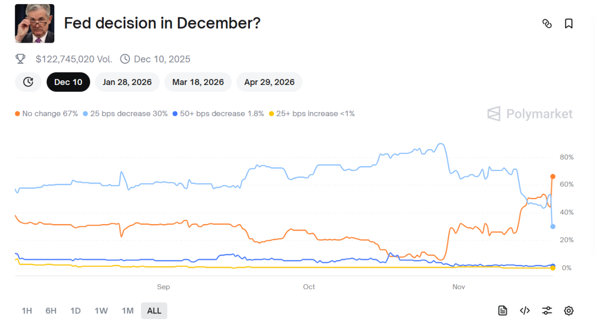CME FedWatch 工具最新數據顯示,12 月降息 25bp 的機率已從兩週前的 95% 暴跌至當 28%。 Polymarket 最新數據顯示,市場押註今年 12 月聯準會降息 25 個基點的機率已跌至 30%,不降息的機率升至 67%。