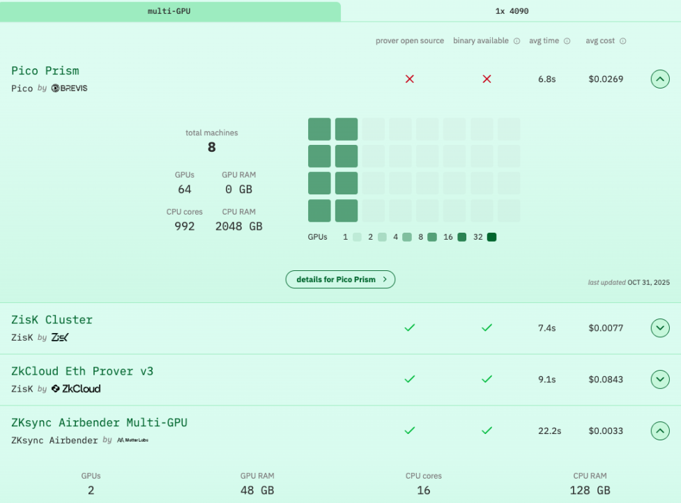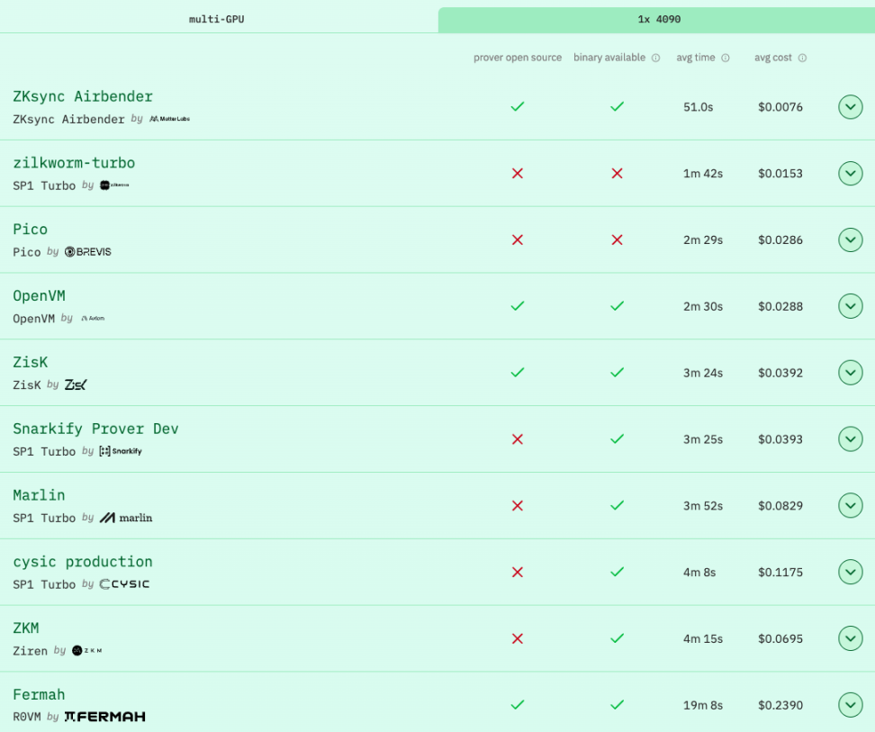 或許很多人都不知道,ZKsync 推出的開源 zkVM ZKsync Airbender 是單一 GPU 驗證速度最快的 zkVM。根據 Ethproofs 數據,使用單張 4090 ZKsync Airbender 平均驗證時間 51 秒,成本不到一美分,二者皆是 zkVM 中最佳成績。