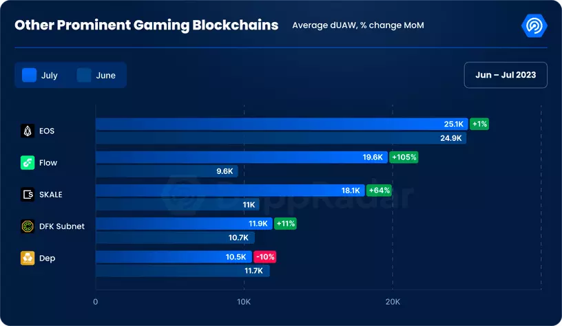 與此同時, BNB Chain已經回升至第二位,其UAW激增43%,達到108,311 dUAW,這一增長主要歸功於Xterio和Gaimin等遊戲平台。雖然本月一些頂級區塊鏈經歷了小幅下滑,但新來者正在嶄露頭角,CryptoBlades和5TARS等遊戲背後的平台SKALE增長了64%,達到18,133 dUAW。而Flow 以驚人的105% 增長令人矚目,達到19,621 dUAW。