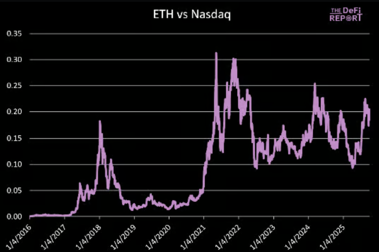 我們的基準假設是:以太坊與納斯達克指數比值隨週期上升的趨勢將持續,本週期內該比值將創下新高(超過0.30)。