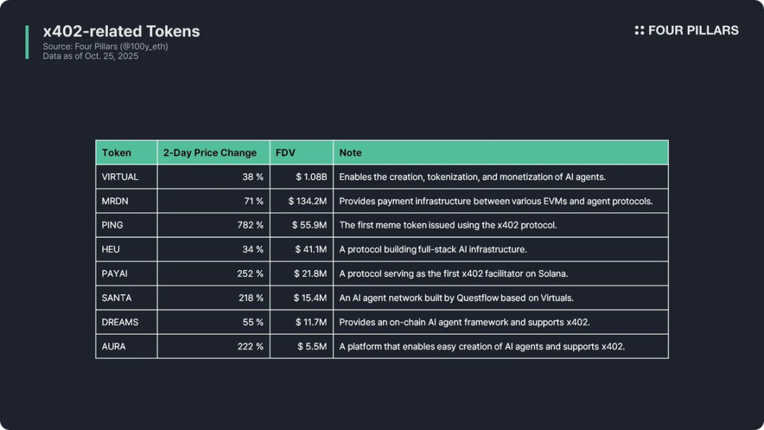 x402 進入炒作階段最直接的訊號,是相關代幣價格的暴漲。例如,每逢「AI 智能體」概念升溫便會連動上漲的代幣 $VIRTUAL,僅兩天內漲幅就達 40%;其他相關代幣也出現了大幅上漲,具體走勢如下列圖表所示。